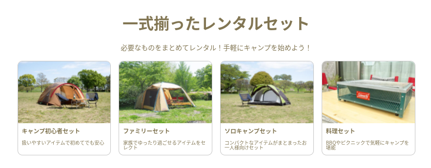 また現地での受け取りが可能なので学生や車の持っていない人でも気軽にキャンプに行ける。