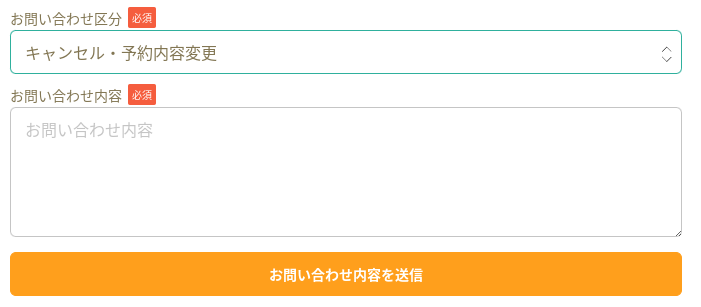 キャンセル方法は連絡フォームのお問い合わせ区分にキャンセル・予約内容変更という選択区分があるので