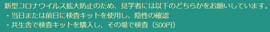 コロナの陰性の人に限って見学・滞在を受け入れている。