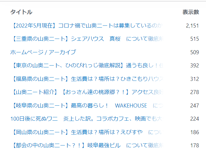 またこんな感じで私のブログで今年最も読まれている記事トップ10のうち9は山奥ニートの記事。
