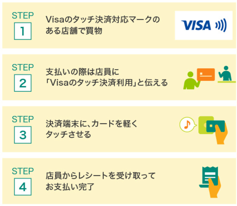 Visaのタッチ決済のやり方をご説明しましょう。店員への伝え方は簡単!Visaのタッチ決済対応マークがある店舗で、支払いの際に「Visaのタッチ決済利用」(店舗によっては「Visaカードで」「Visaをタッチで」と伝える必要があります)と伝えるだけです。あとは決済端末にカードやスマートフォンなどのデバイスをタッチすればお支払いできます。