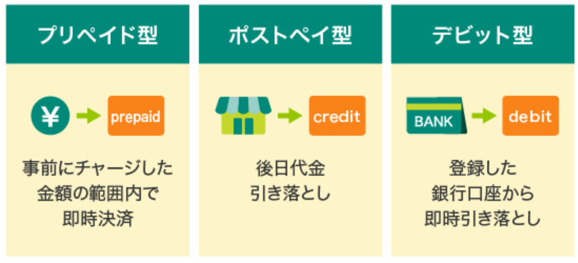 三井住友カードが発行するものでいえば、プリペイド型なら「Visaプリペ」、ポストペイ型は一般的なクレジットカードである「三井住友カード」、デビット型なら「SMBCデビット」となります。