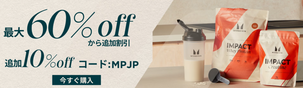 上の画像のセールだと【MPJP】を会計時に入力すればさらに10%オフで買えます。
